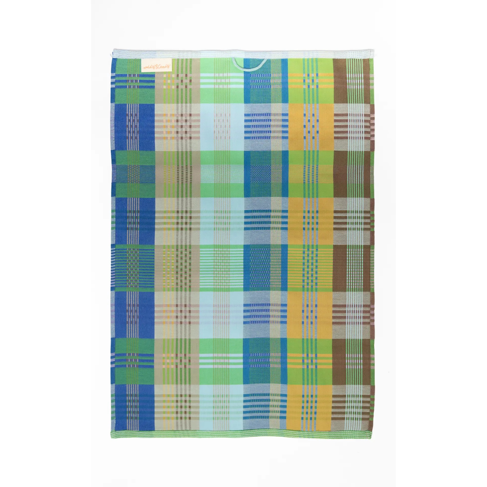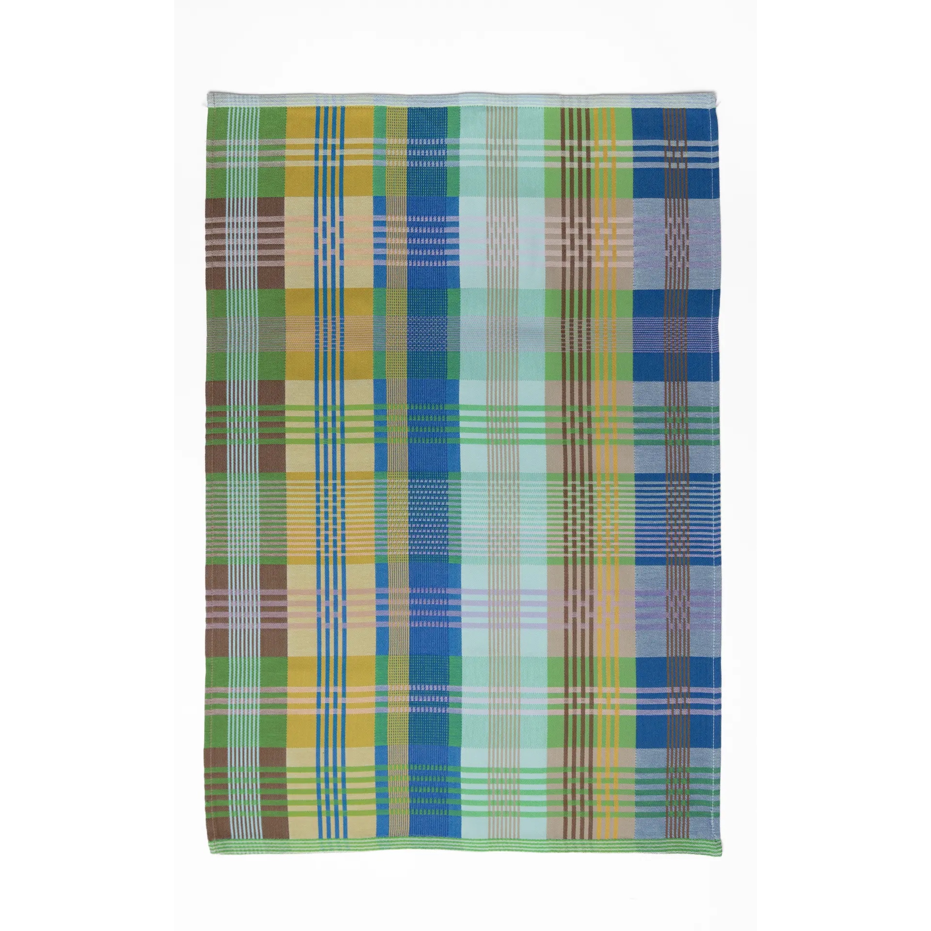 Bunt kariertes Geschirrtuch mit großflächigem Patchwork-Muster in Blau-, Grün-,Gelb-, Hellblau- und Brauntönen, mit weißer Aufhängeschlaufe oben mittig und schmalen, gestreiften Abschlusskanten.